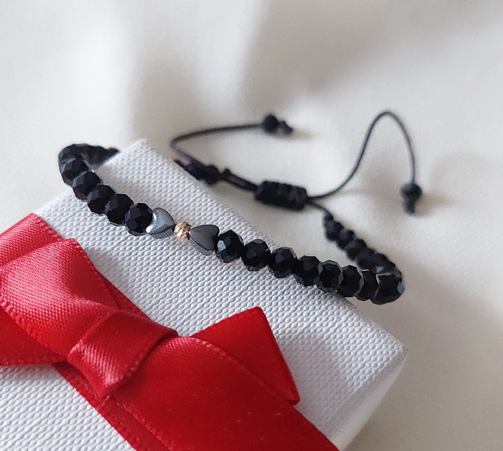 Brățară cu fundiță din inimioare Hematit și cristale negre fațetate de 4 mm și biluță din Aur 14K de 2,5 mm.