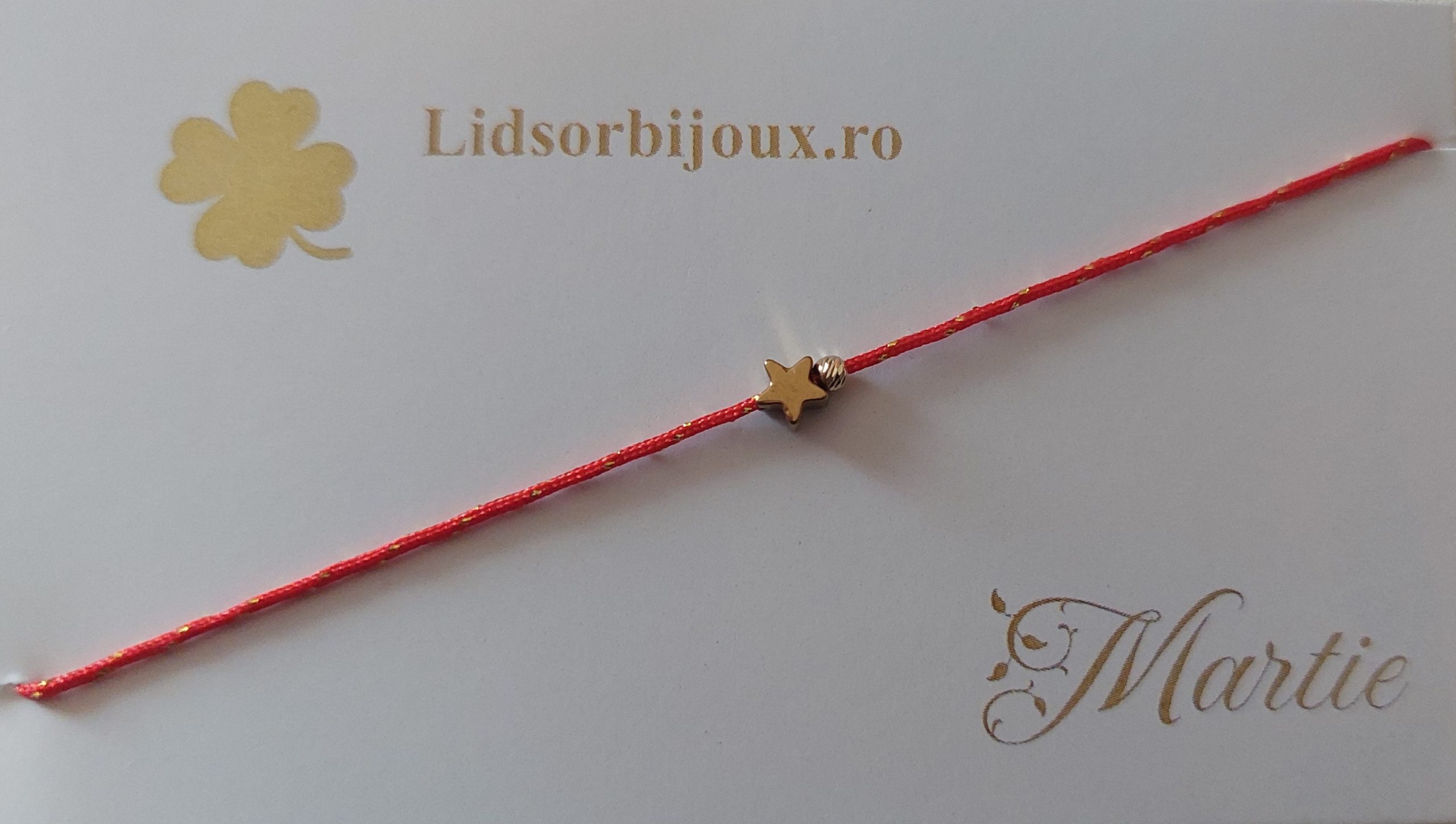Brățară Mărțișor cu stea din Hematit auriu, o biluță de 2 mm din Aur 14K, șnur roșu cu auriu. Bijuteriile Lidsor sunt realizate manual din iubire și grijă pentru purtător. Facem bijuterii care să creeze conexiuni și care să ofere mereu emoții pozitive. Fiind un produs lucrat manual în atelierul nostru, bijuteria nu se vinde la gram. Se vinde ca și piesă/ bucată. Chiar și în aceste condiții pot exista diferențe de culoare între pozele de prezentare și produsul comandat.