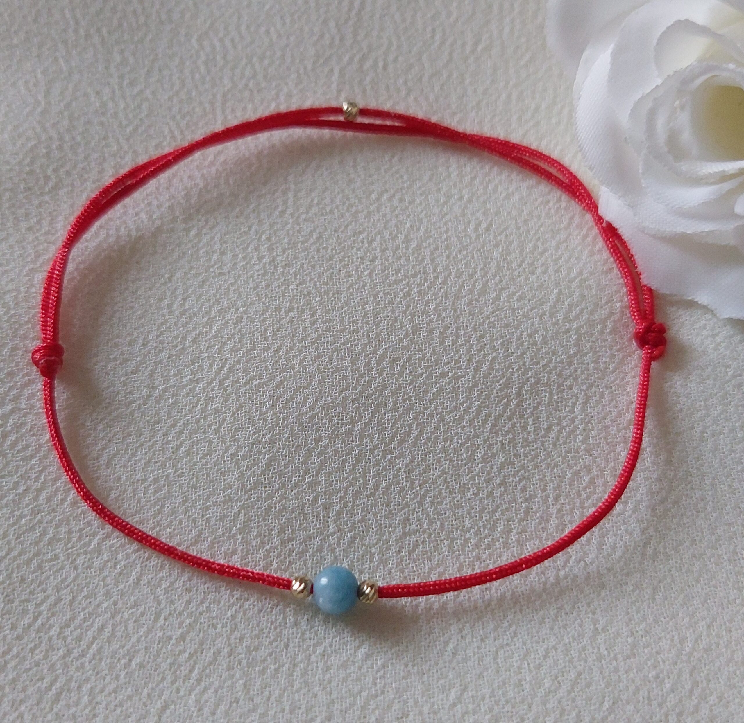 Brățară circulară reglabilă, cu șnur roșu, piatră semiprețioasă Angelit înfrumusețată cu biluțe striate din Aur 14K de 2 mm. Culoarea roșie simbolizează adesea iubirea, fericirea și bunăstarea. Astfel, purtarea unei brățări cu șnur roșu este considerată un act de apărare împotriva influențelor negative, având rolul de a aduce noroc și prosperitate purtătorului. Piatra semiprețioasă Angelit este piatra norocoasă a nativilor din zodiile Vărsător, Pești, Gemeni, Balanță. Fiind un produs lucrat manual în atelierul nostru, bijuteria nu se vinde la gram. Se vinde ca și piesă/ bucată. Chiar și în aceste condiții pot exista diferențe de culoare între pozele de prezentare și produsul comandat. Se poate realiza pe dimensiunea dorită și orice culoare la șnur, menționând în secțiunea ,, Note comandă (opțional)”.