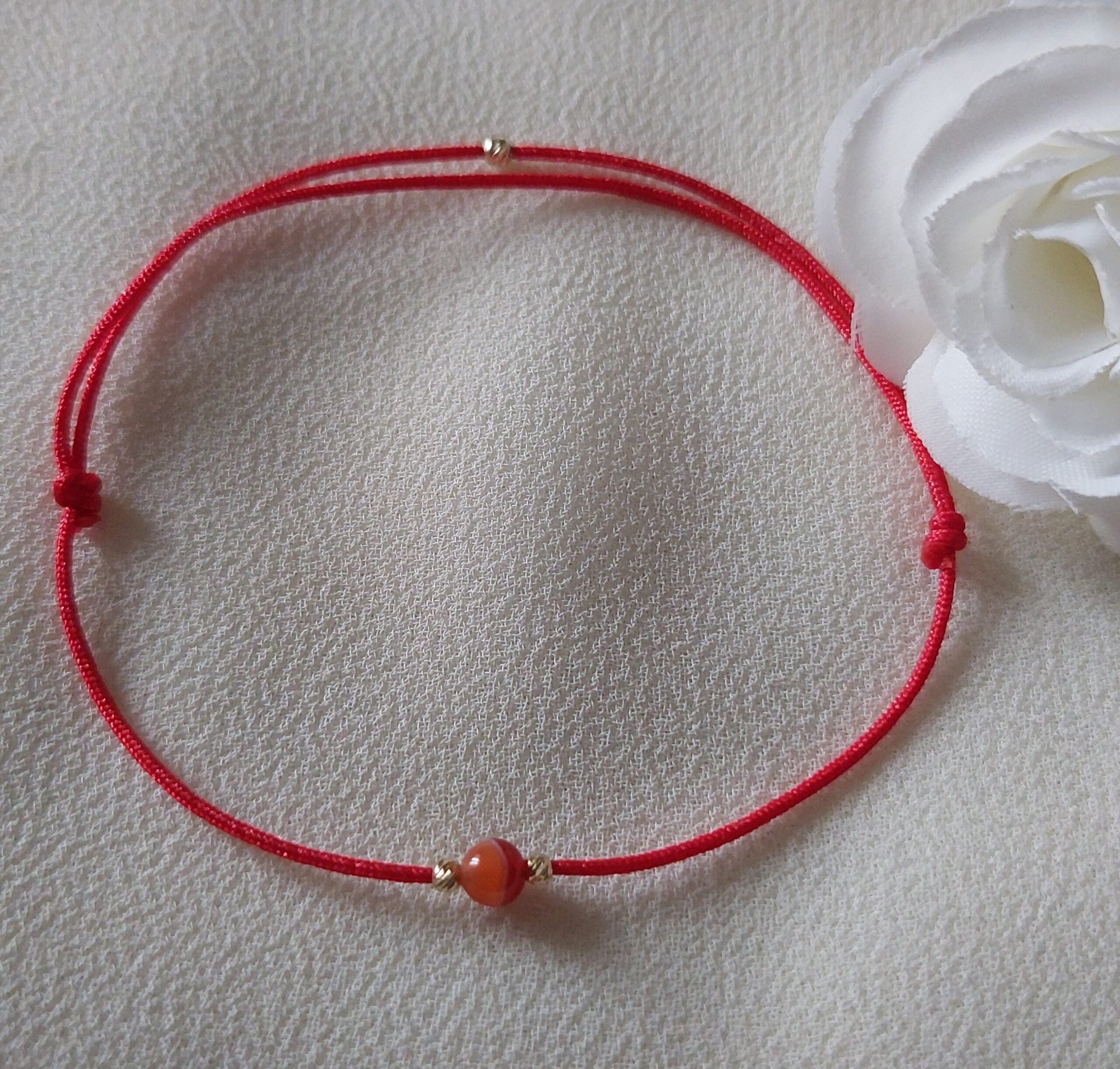 Brățară circulară reglabilă, cu șnur roșu, piatră semiprețioasă Carneol înfrumusețată cu biluțe striate din Aur 14K de 2 mm. Culoarea roșie simbolizează adesea iubirea, fericirea și bunăstarea. Astfel, purtarea unei brățări cu șnur roșu este considerată un act de apărare împotriva influențelor negative, având rolul de a aduce noroc și prosperitate purtătorului. Piatra semiprețioasă Carneol este piatra norocoasă a nativilor din zodiile Berbec, Taur, Leu, Fecioară. Fiind un produs lucrat manual în atelierul nostru, bijuteria nu se vinde la gram. Se vinde ca și piesă/ bucată. Chiar și în aceste condiții pot exista diferențe de culoare între pozele de prezentare și produsul comandat. Se poate realiza pe dimensiunea dorită și orice culoare la șnur, menționând în secțiunea ,, Note comandă (opțional)”.