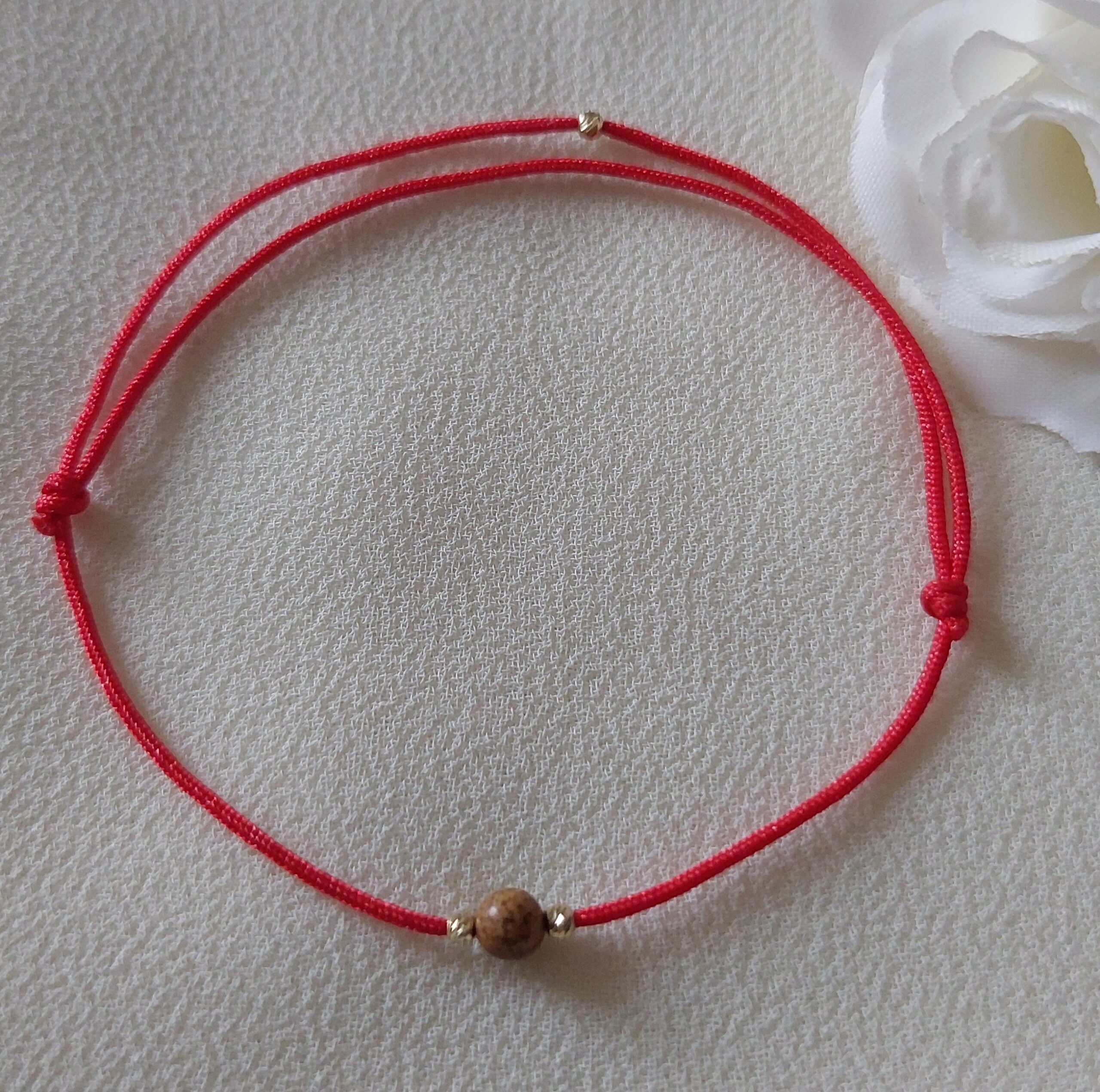 Brățară circulară cu șnur roșu, piatră semiprețioasă Jasp și biluțe din Aur 14K de 2 mm.
