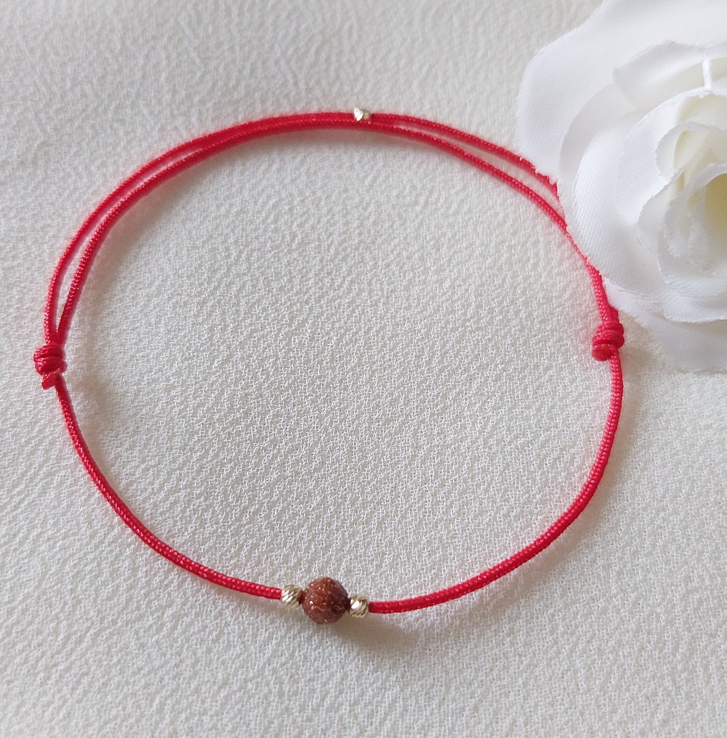 Brățară circulară reglabilă, cu șnur roșu, piatră semiprețioasă Piatra Soarelui maro înfrumusețată cu biluțe striate din Aur 14K de 2 mm. Culoarea roșie simbolizează adesea iubirea, fericirea și bunăstarea. Astfel, purtarea unei brățări cu șnur roșu este considerată un act de apărare împotriva influențelor negative, având rolul de a aduce noroc și prosperitate purtătorului. Piatra Soarelui este piatra norocoasă a nativilor din zodiile Leu, Berbec, Săgetător. Fiind un produs lucrat manual în atelierul nostru, bijuteria nu se vinde la gram. Se vinde ca și piesă/ bucată. Chiar și în aceste condiții pot exista diferențe de culoare între pozele de prezentare și produsul comandat. Se poate realiza pe dimensiunea dorită și orice culoare la șnur, menționând în secțiunea ,, Note comandă (opțional)”.
