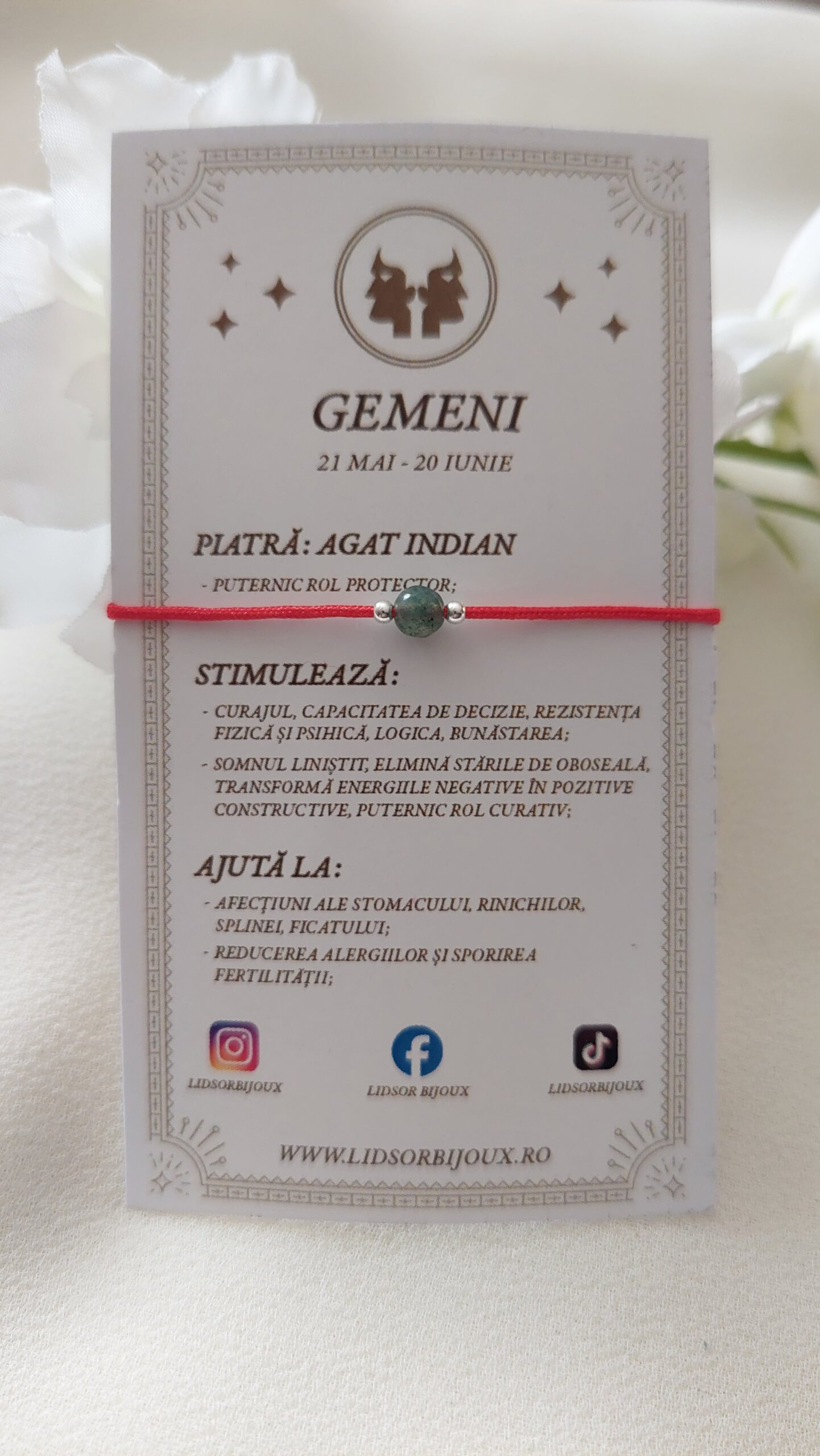 Această brățară distinctivă îmbină misticismul astrologiei cu eleganța Argintului 925, oferind purtătorului/purtătoarei o piesă de bijuterie personală și semnificativă. Confecționată cu grijă, această brățară este un accesoriu rafinat și plin de semnificație. Piatra Agat indian verde cu diametrul de 4 mm este specifică zodiei gemeni, aducând o notă de sensibilitate și intuiție purtătorilor. Brățara are un șnur reglabil, ceea ce o face comfortabilă și ușor de ajustat pentru orice dimensiune de încheietură. Design-ul său simplu și elegant o face ideală pentru purtarea zilnică, adăugând un plus de rafinament și personalitate oricărei ținute.