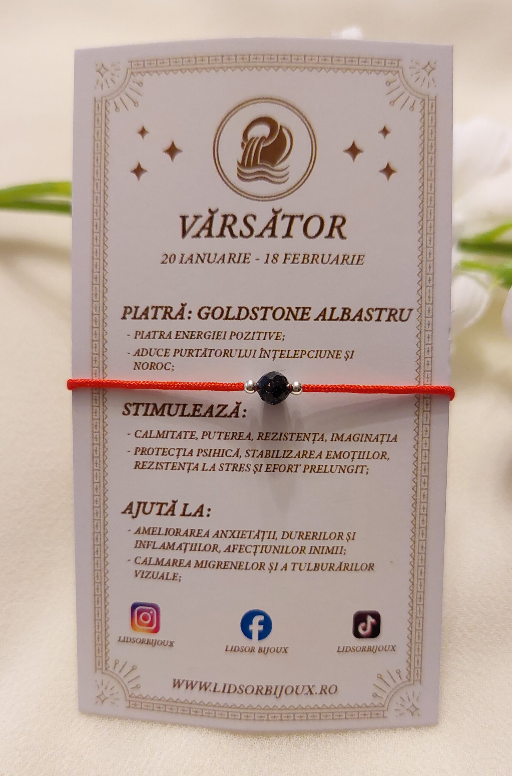 Această brățară distinctivă îmbină misticismul astrologiei cu eleganța Argintului 925, oferind purtătorului/purtătoarei o piesă de bijuterie personală și semnificativă. Confecționată cu grijă, această brățară este un accesoriu rafinat și plin de semnificație. Piatra Goldstone cu diametrul de 4 mm este specifică zodiei vărsător, aducând o notă de sensibilitate și intuiție purtătorilor. Brățara are un șnur reglabil, ceea ce o face comfortabilă și ușor de ajustat pentru orice dimensiune de încheietură. Design-ul său simplu și elegant o face ideală pentru purtarea zilnică, adăugând un plus de rafinament și personalitate oricărei ținute.